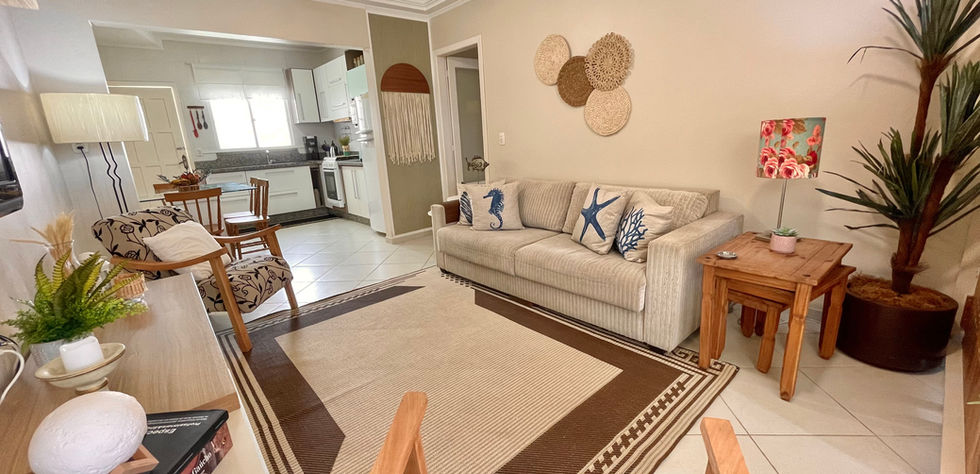 A sala de estar é conjugada com a copa e a cozinha, onde o hóspede poderá dispor de todos os utensílios e eletrodomésticos necessários para uma temporada de descanso e conforto.
