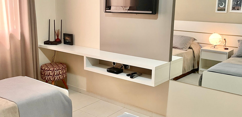 QUARTO 3: com móveis sob medida, ar condicionado e um ventilador de teto, este quarto possui 2 camas de solteiro e uma televisão. Para acomodar uma terceira pessoa, ainda dispõe de uma cama auxiliar.